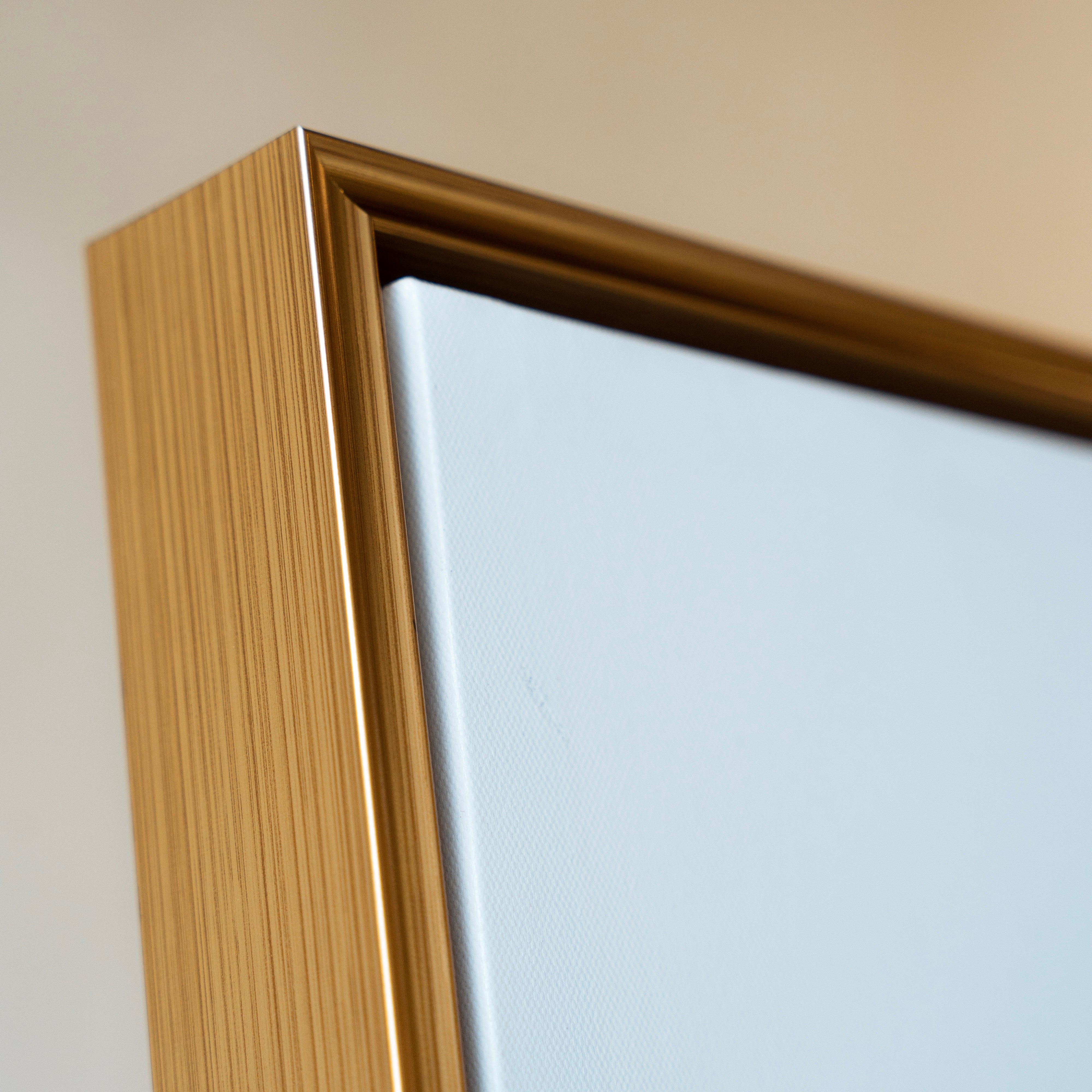 The beveled profile of this gold poly frame features a soft, curved dip along the front ā adding a graceful, sculpted detail. Our gold frames share the same gold tone ā multidimensional, warm, and reflective. This frame is gold on all sides. Approximately ½" of our Beveled Frames are visible on the front and add ¾" to the overall width and height of the Canvas.
